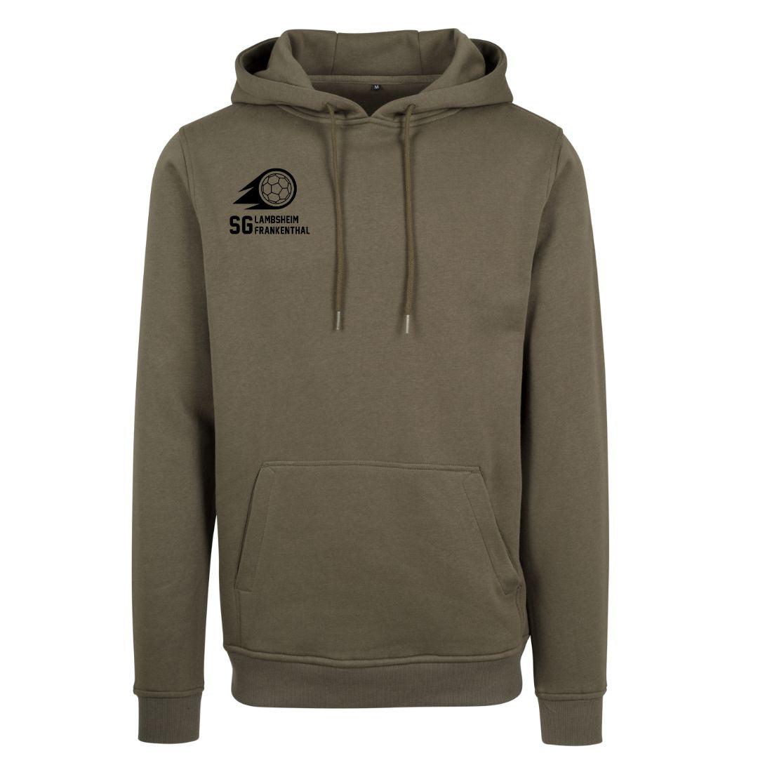 Klassischer Handball Hoodie mit Kapuze und Känguru-Tasche, den du im Training und draußen auf der Straße tragen kannst. Ikonisches Logo Motiv fett auf dem Rücken, kleines Motiv auf der Brust. Statement: Du bist Teil der SG.